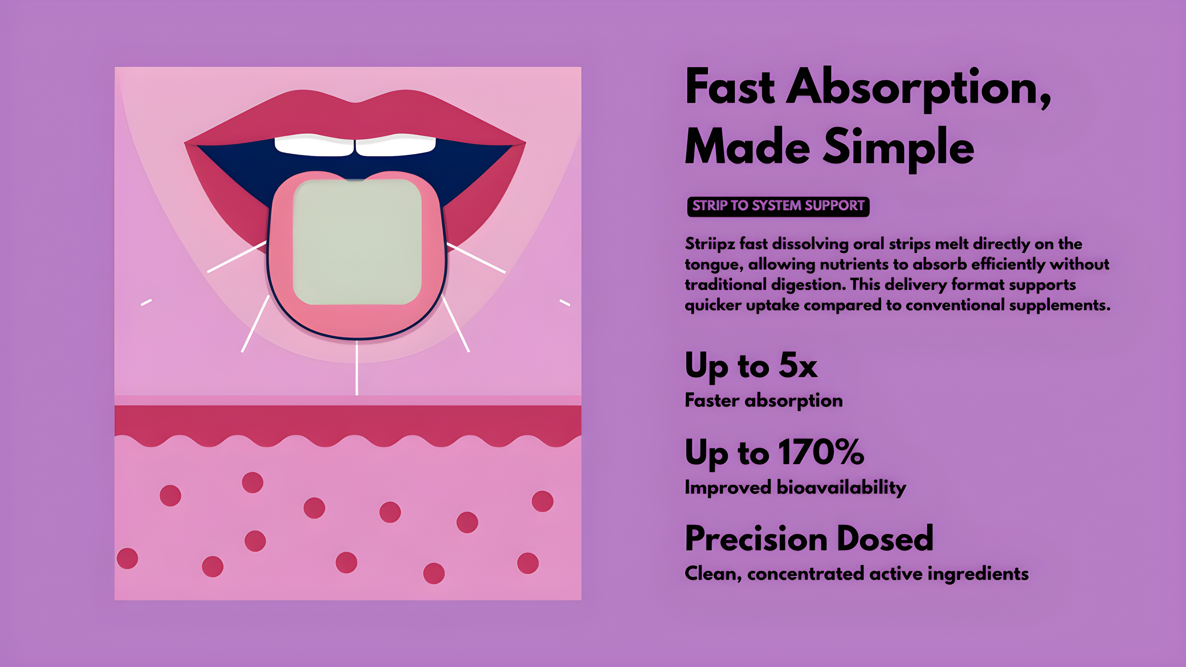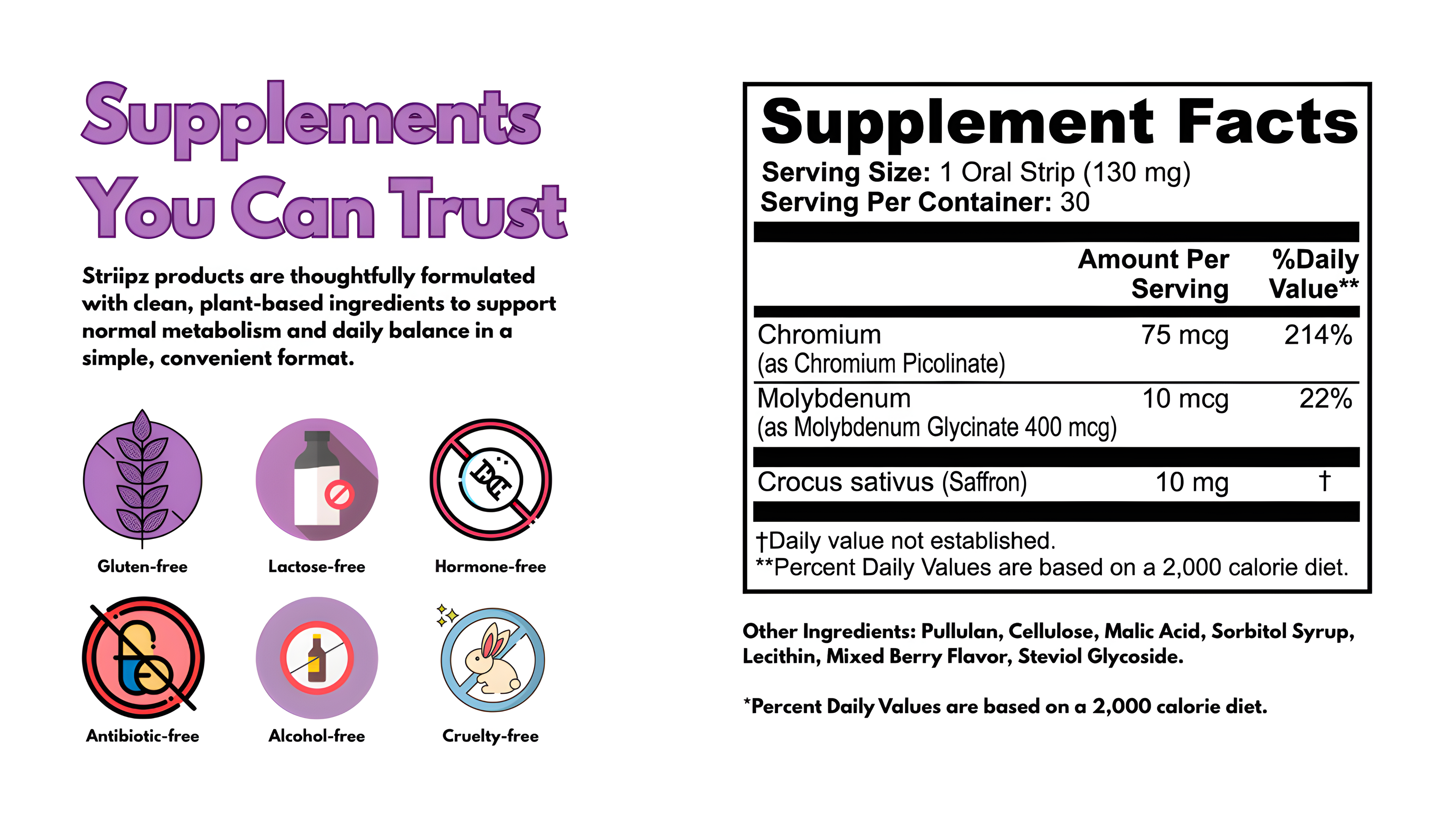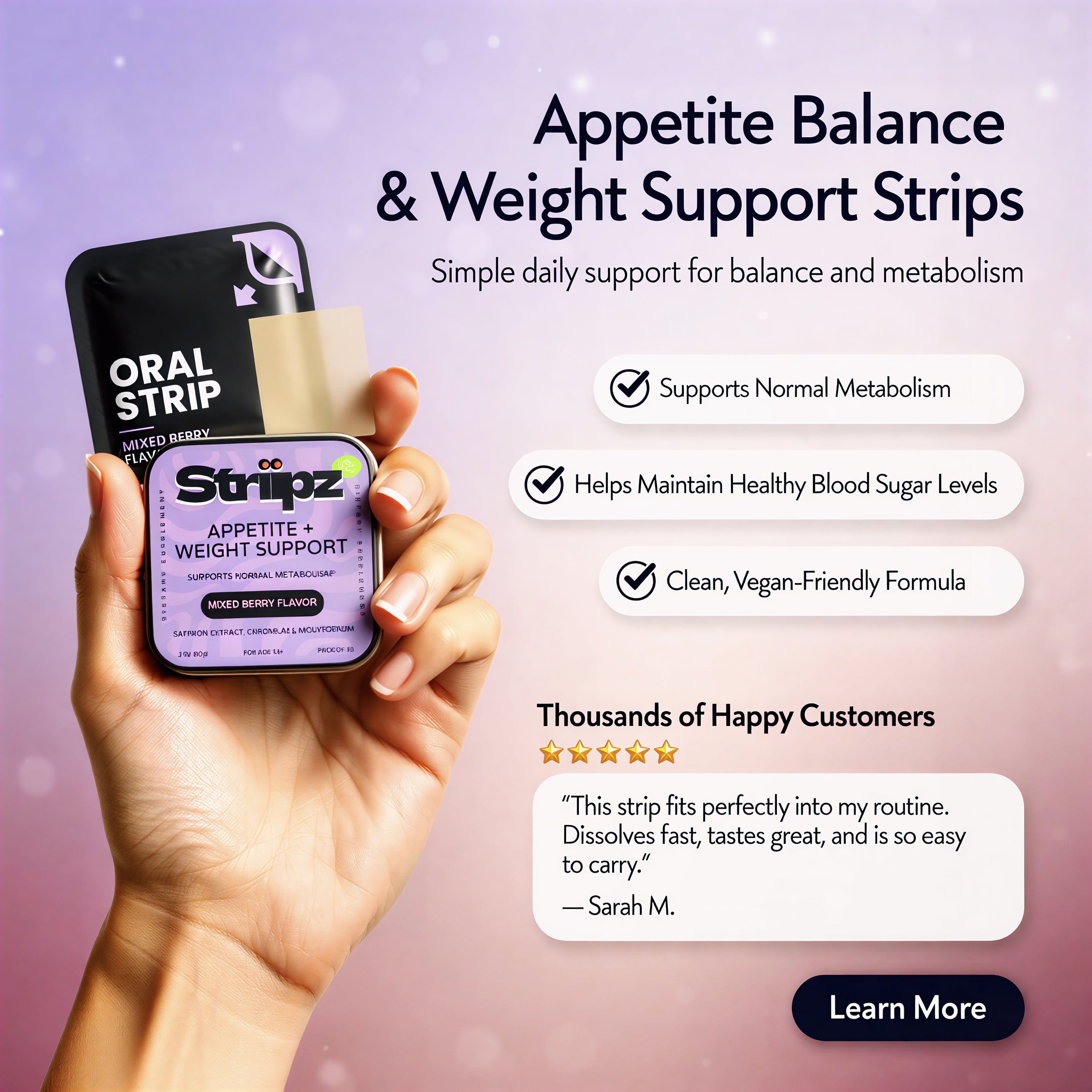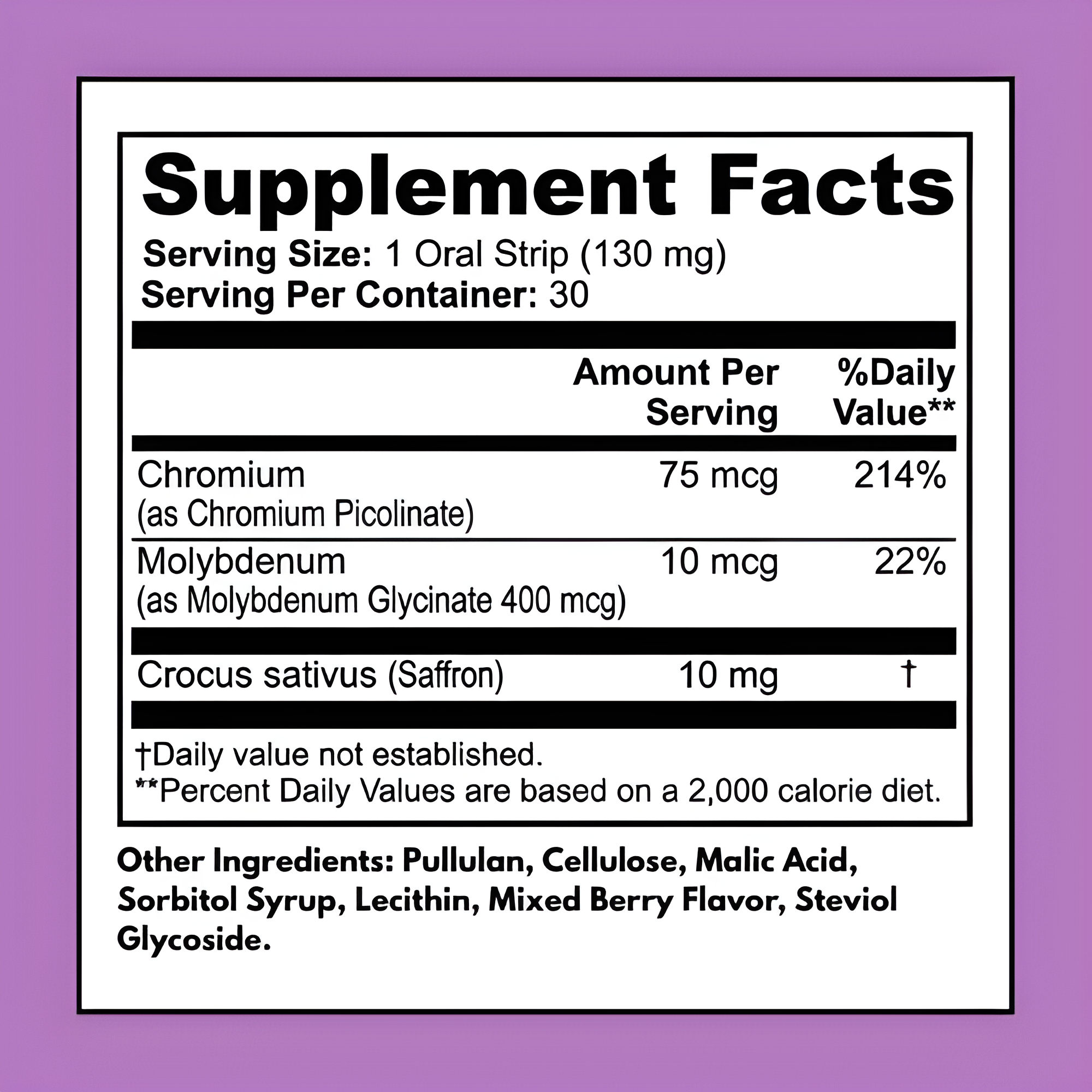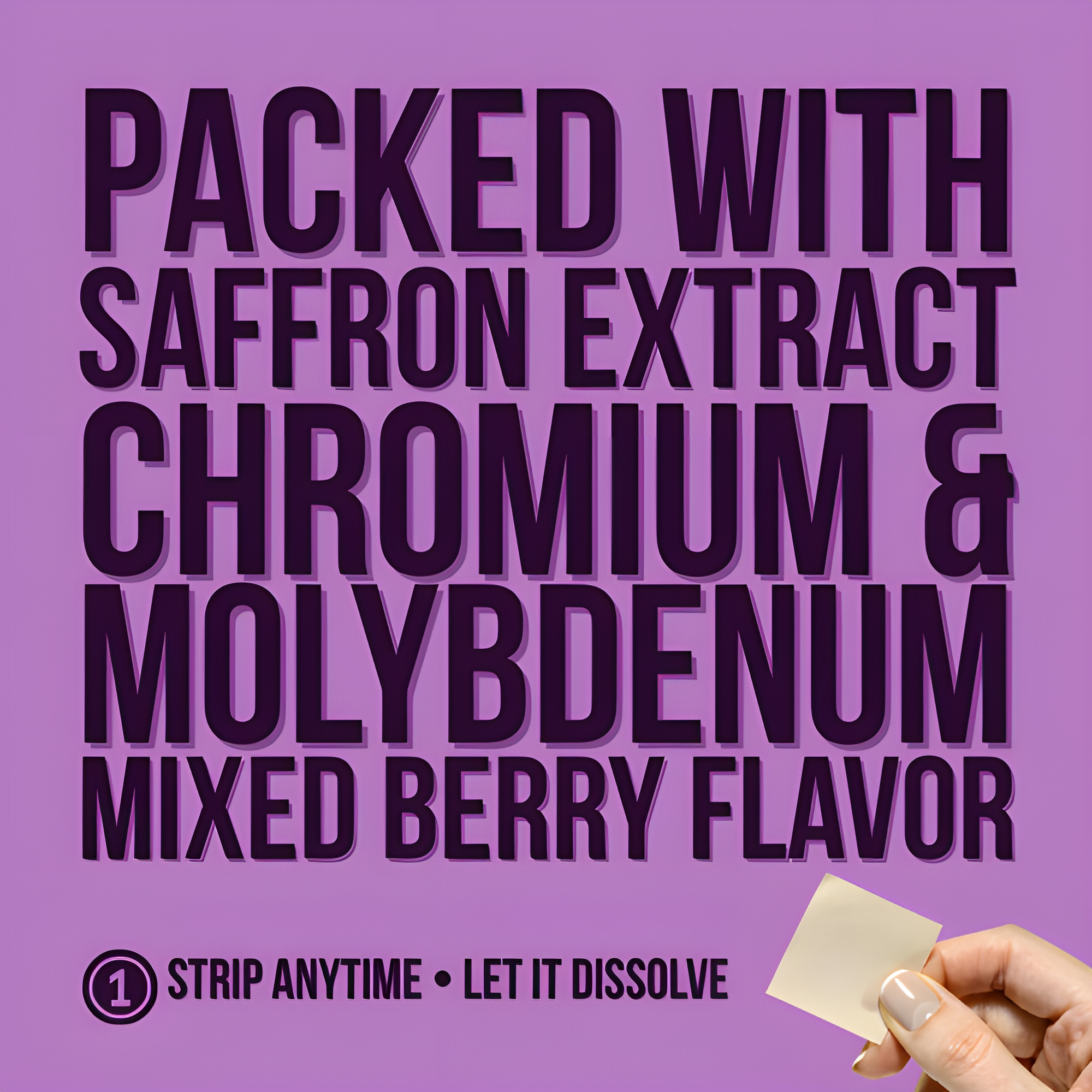 A simple, on-the-go oral strip designed to support mindful eating habits, healthy metabolism, and balanced daily wellness through a blend of Saffron, Chromium, and Molybdenum.