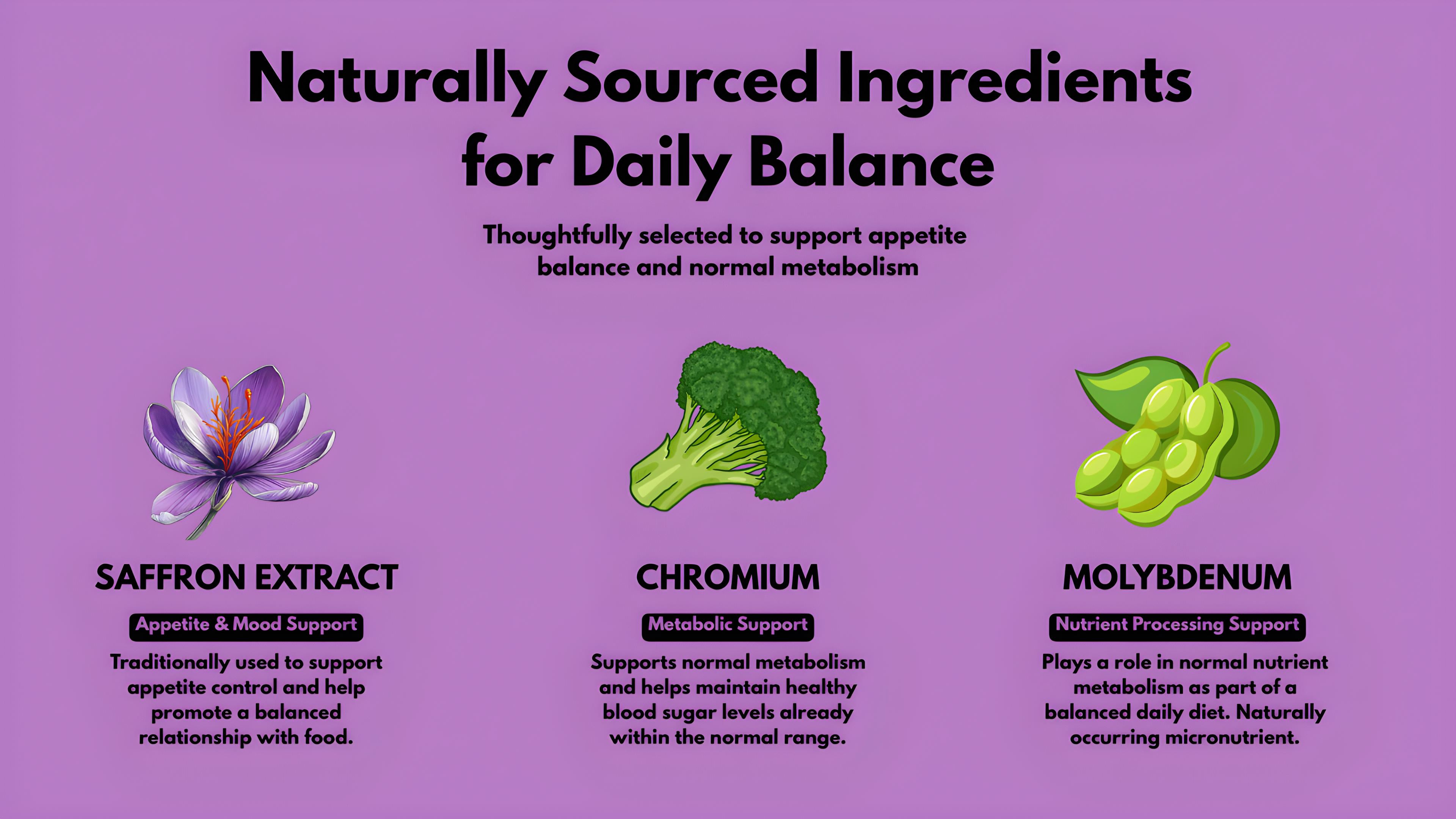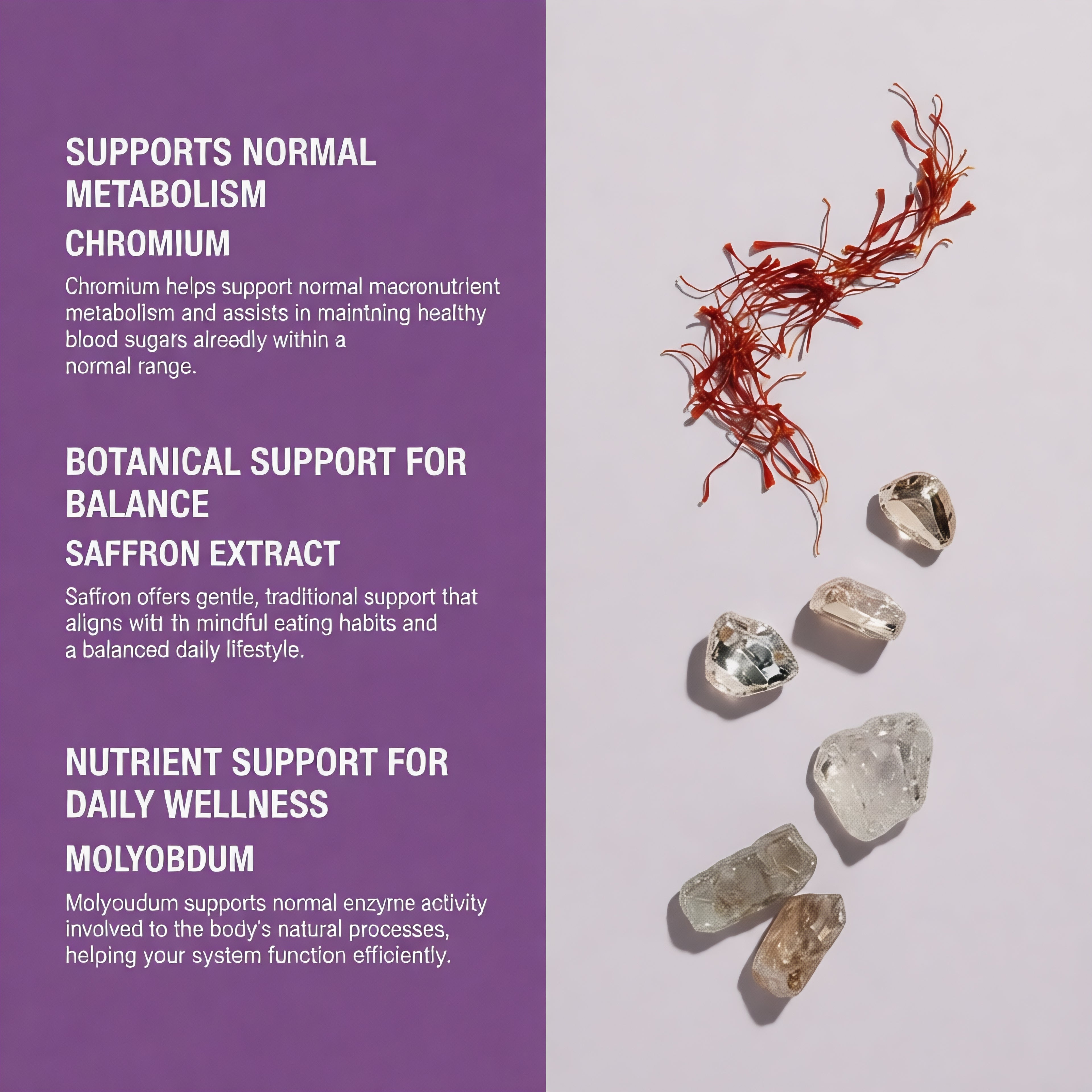 - Provides Botanical Support for Balance: Saffron extract contributes gentle, traditional support for maintaining balance alongside mindful eating and an active lifestyle.