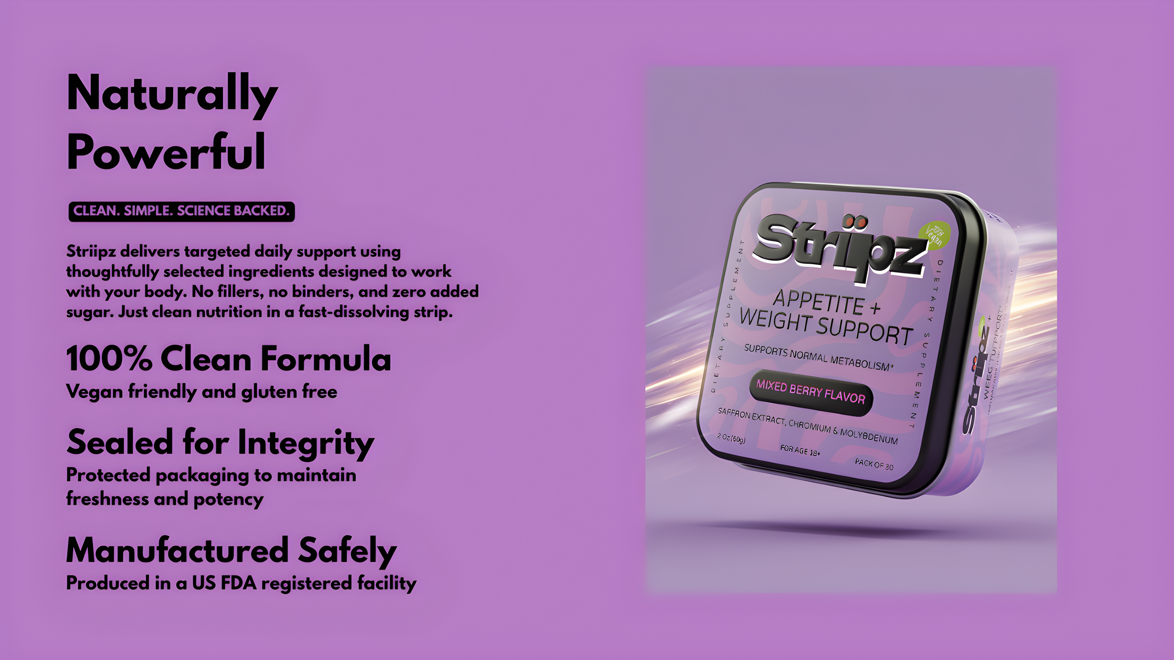 - Consistency is Key: With a light, refreshing format, incorporating the Appetite Balance & Weight Support Strips into a convenient daily routine helps complement a health-conscious and active lifestyle.