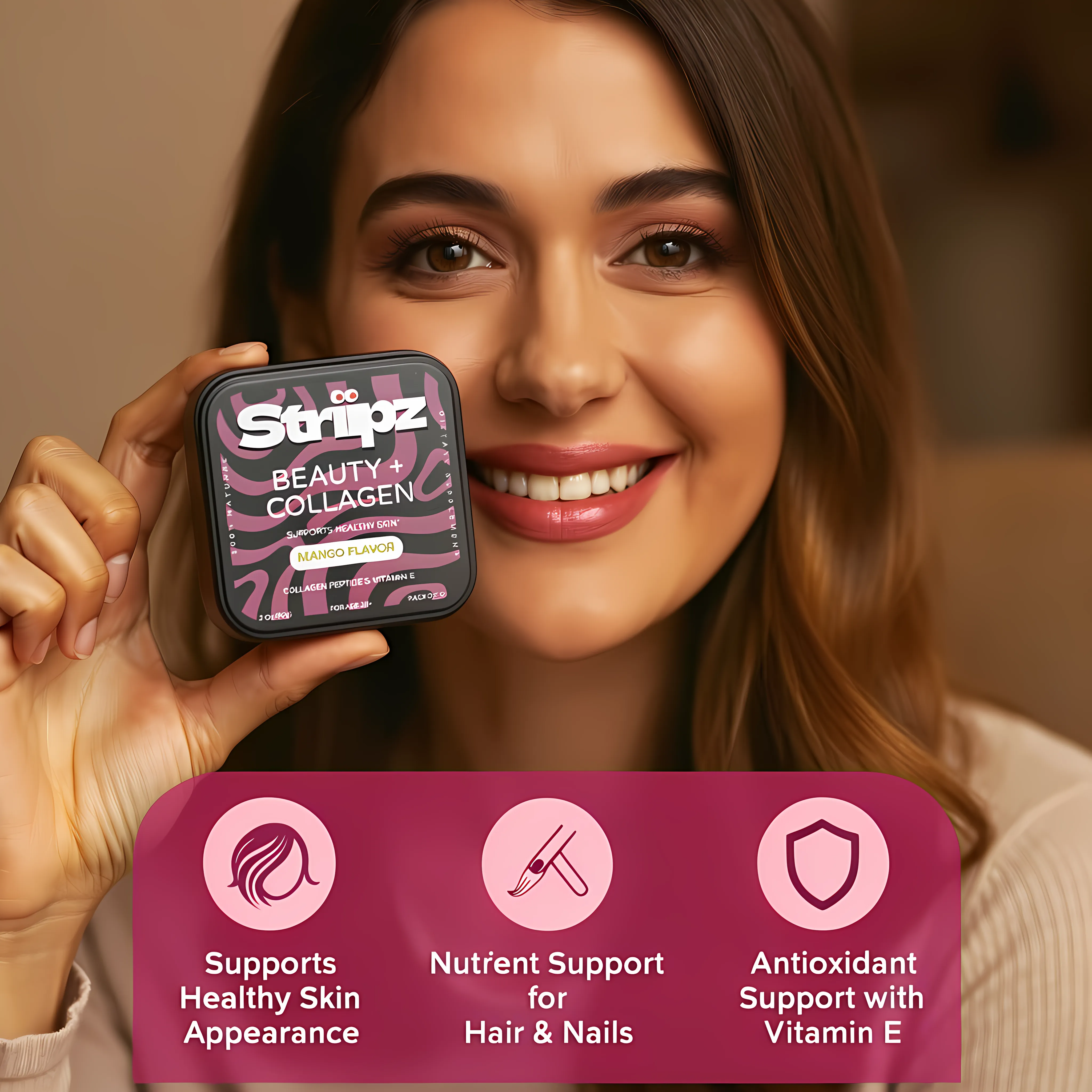 Support your daily beauty routine with fast-dissolving oral strips made with Collagen Peptides and Vitamin E. These mango-flavored strips help maintain healthy-looking skin, hair, and nails and are easy to enjoy anytime — just place one on your tongue and let it dissolve.