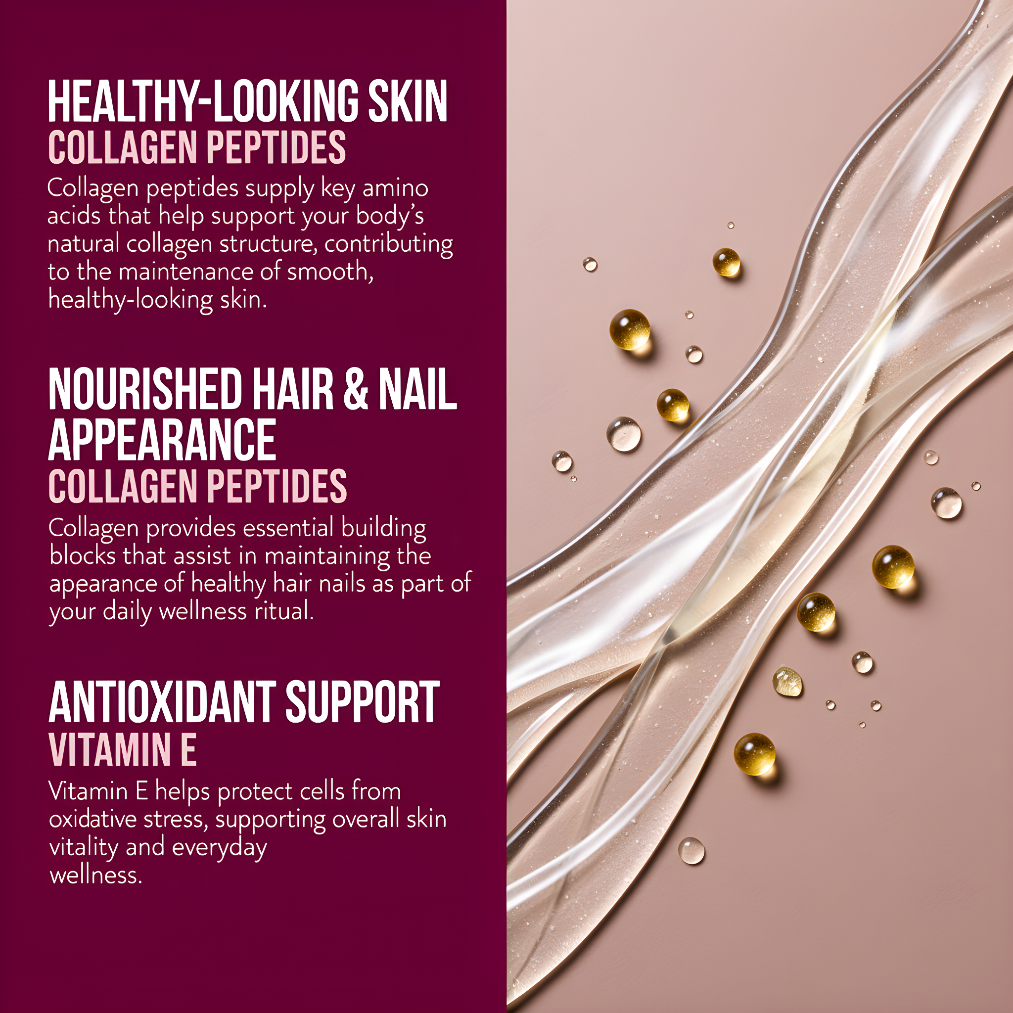 - Nutrient Support for Hair & Nail Appearance: Collagen contributes essential building blocks that help maintain the appearance of strong, healthy hair and nails.