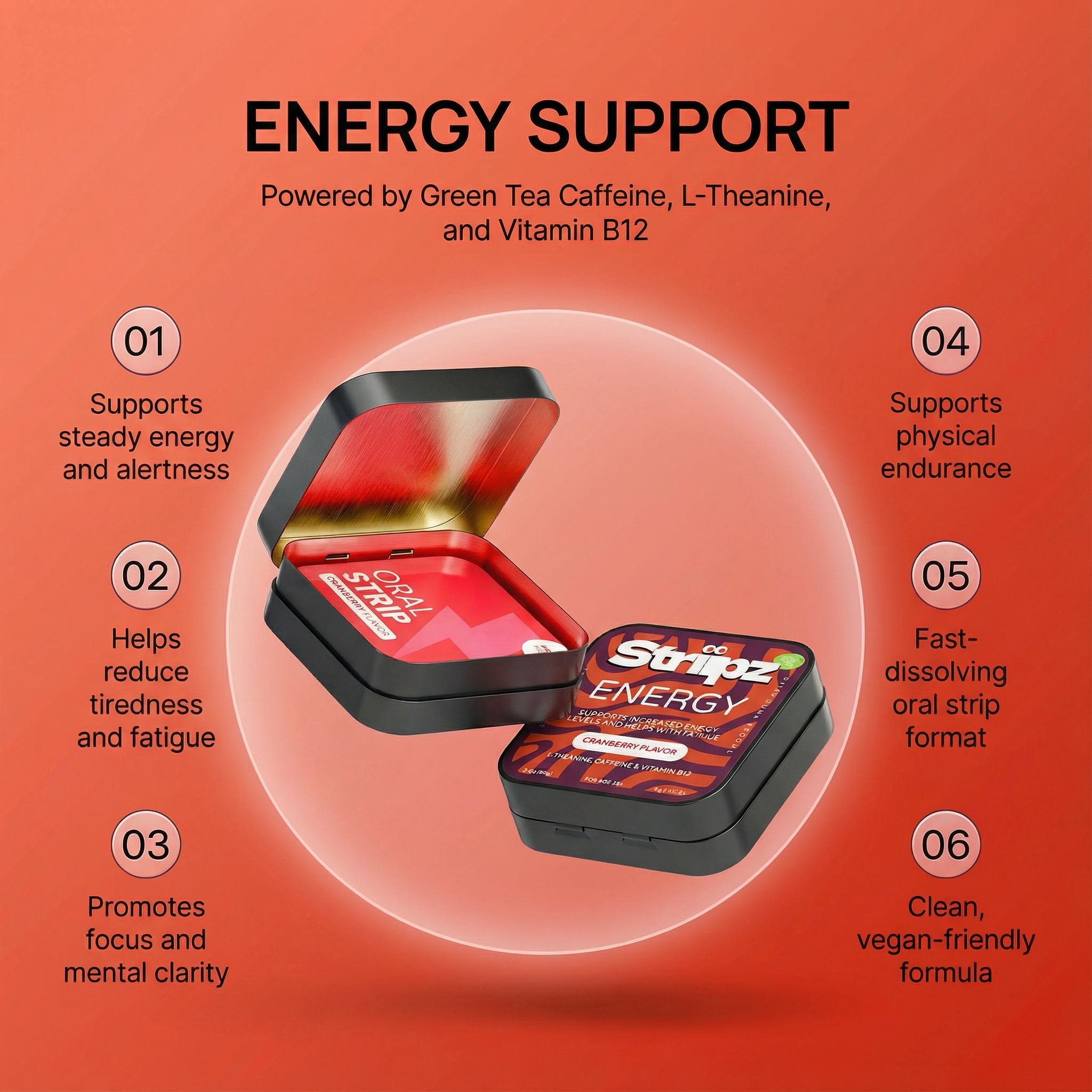 - Convenient On-the-Go Format: The fast-dissolving oral strips offer quick absorption and are easy to carry, making energy support simple anytime.