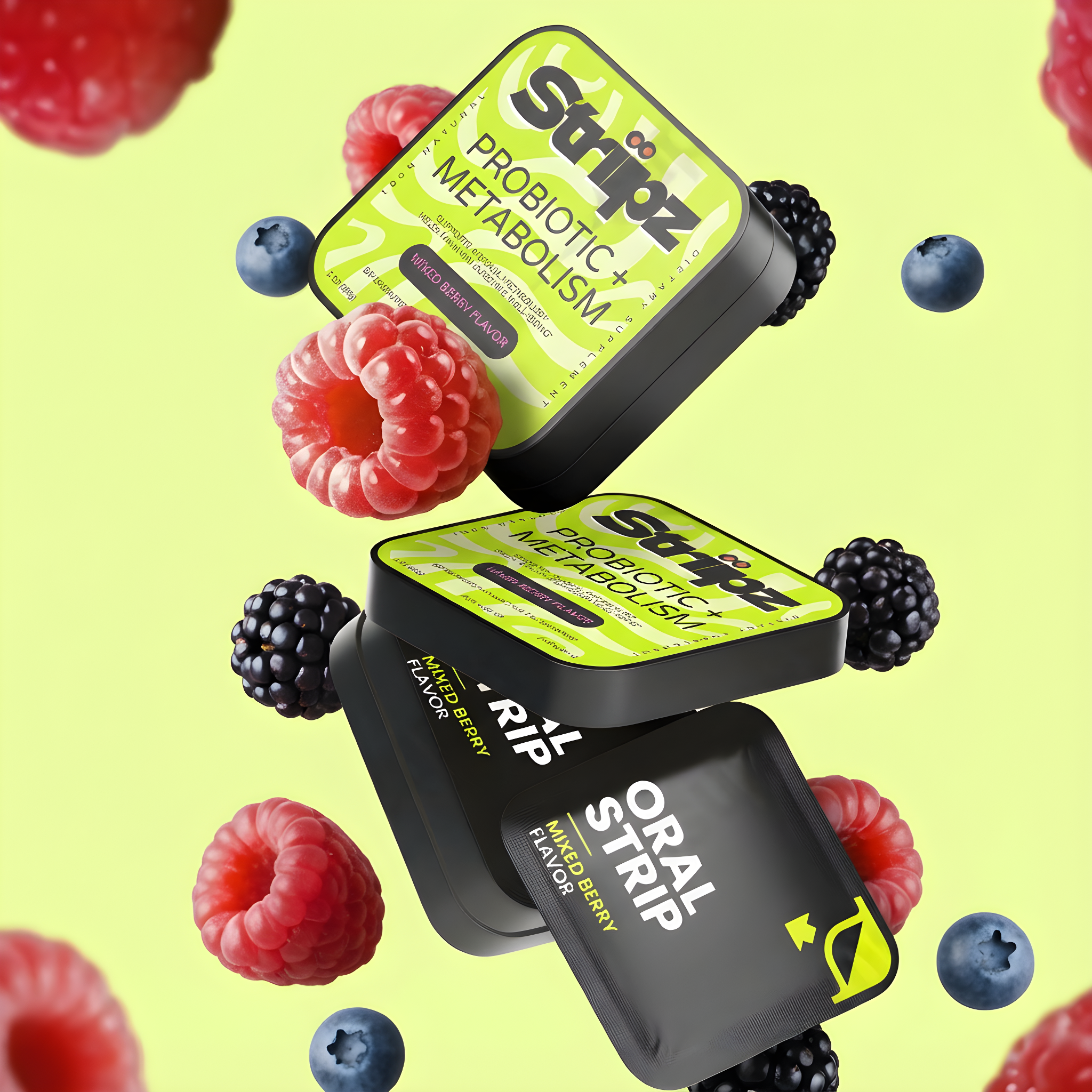Support your gut health with quick dissolving Probiotic + Metabolism Strips. Each strip offers 10 billion CFU plus prebiotic fiber to help maintain digestive balance. Easy to take anytime and finished with a refreshing mixed berry flavor.