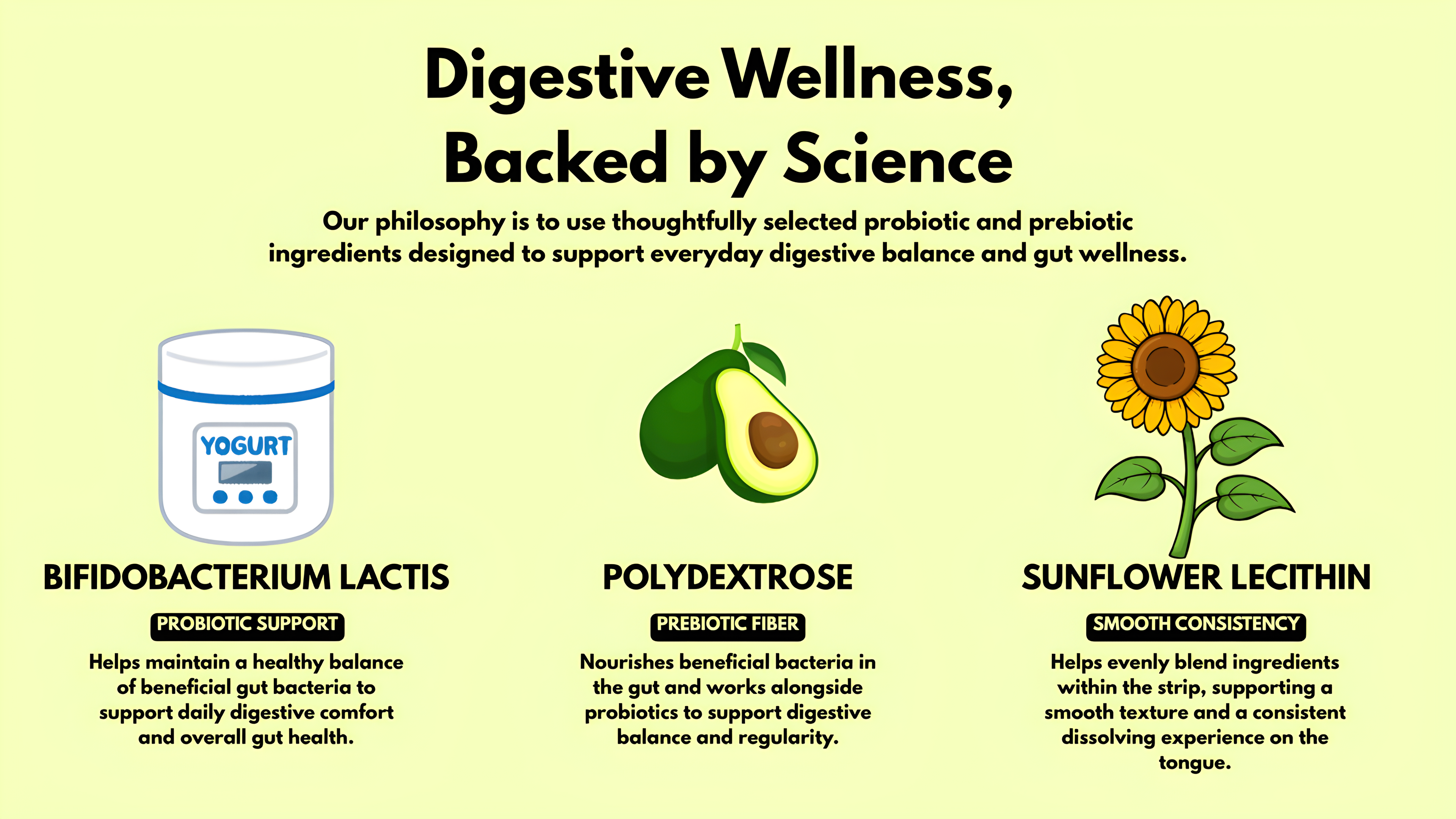 - Supports Everyday Digestive Balance: Each strip provides 10 billion CFU of Bifidobacterium lactis that helps maintain a balanced gut environment as part of daily digestive wellness.